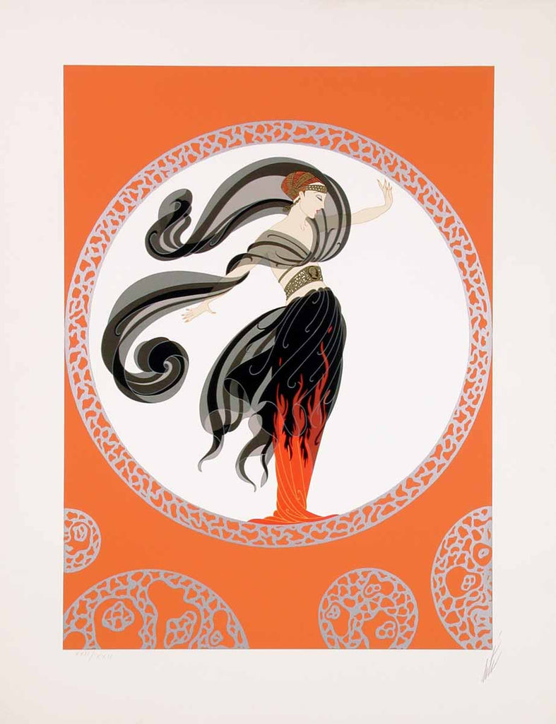"Flames of Love" is a serigraph created by Erté in 1978. From the edition of 413, the artwork is signed 'Erté' lower right. The image size is 21.5 x 16" and the artwork is framed in a contemporary black frame. The artwork ships framed and accompanied by a certificate of authenticity.