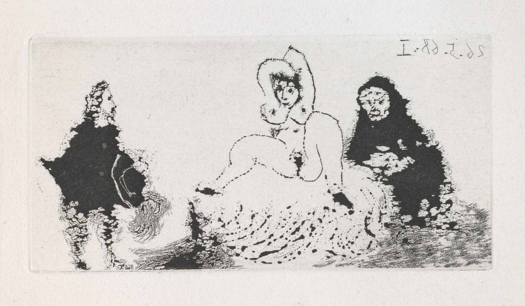 "Gentleman Visiting Célestine (B.1592)" is an aquatint created by Pablo Picasso in 1968 for his series 'La Célestine'. From the edition of 400, the image size is 2 x 5". The artwork ships framed and accompanied by a certificate of authenticity.