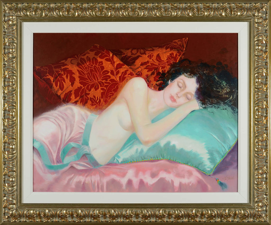 "Los Sueños" is a serigraph on linen created by Felix Mas in 2011. From the edition of 327, the artwork is signed 'Felix Mas' lower right and annotated lower left. the canvas size is 25 x 32" and the artwork is framed in an ornate, gold-tone frame. The artwork ships framed and accompanied by a certificate of authenticity.