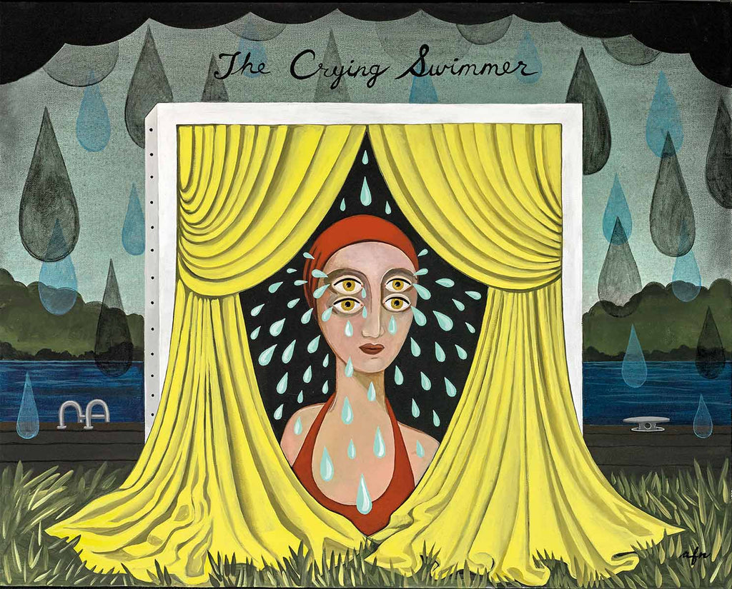 "The Crying Swimmer" is an acrylic on canvas painting created by Anne Faith Nicholls in 2016. The artwork is signed 'afn' lower right. The canvas size is 24 x 30" and the artwork is framed in a contemporary black frame. The artwork ships framed.