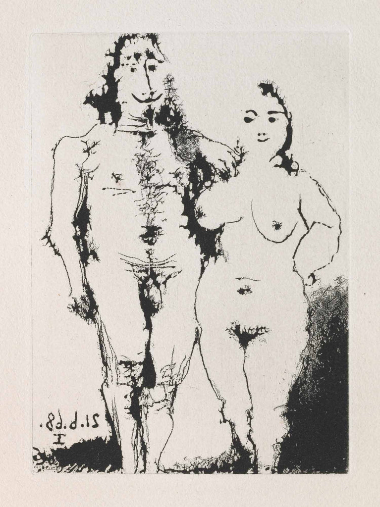 "Nude Couple Posing (B.1654)" is an aquatint created by Pablo Picasso in 1968 for his series 'La Célestine'. From the edition of 400, the image size is 5 x 4". The artwork ships framed and accompanied by a certificate of authenticity.