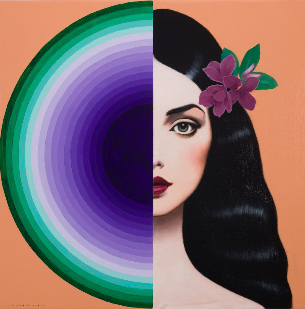 "Peekaboo" is an oil and mixed media on canvas painting created by François Fressinier in 2024. The artwork is signed 'FRESSINIER' lower left. The canvas size is 24 x 24" and the artwork is framed in a contemporary black frame. The artwork ships framed.