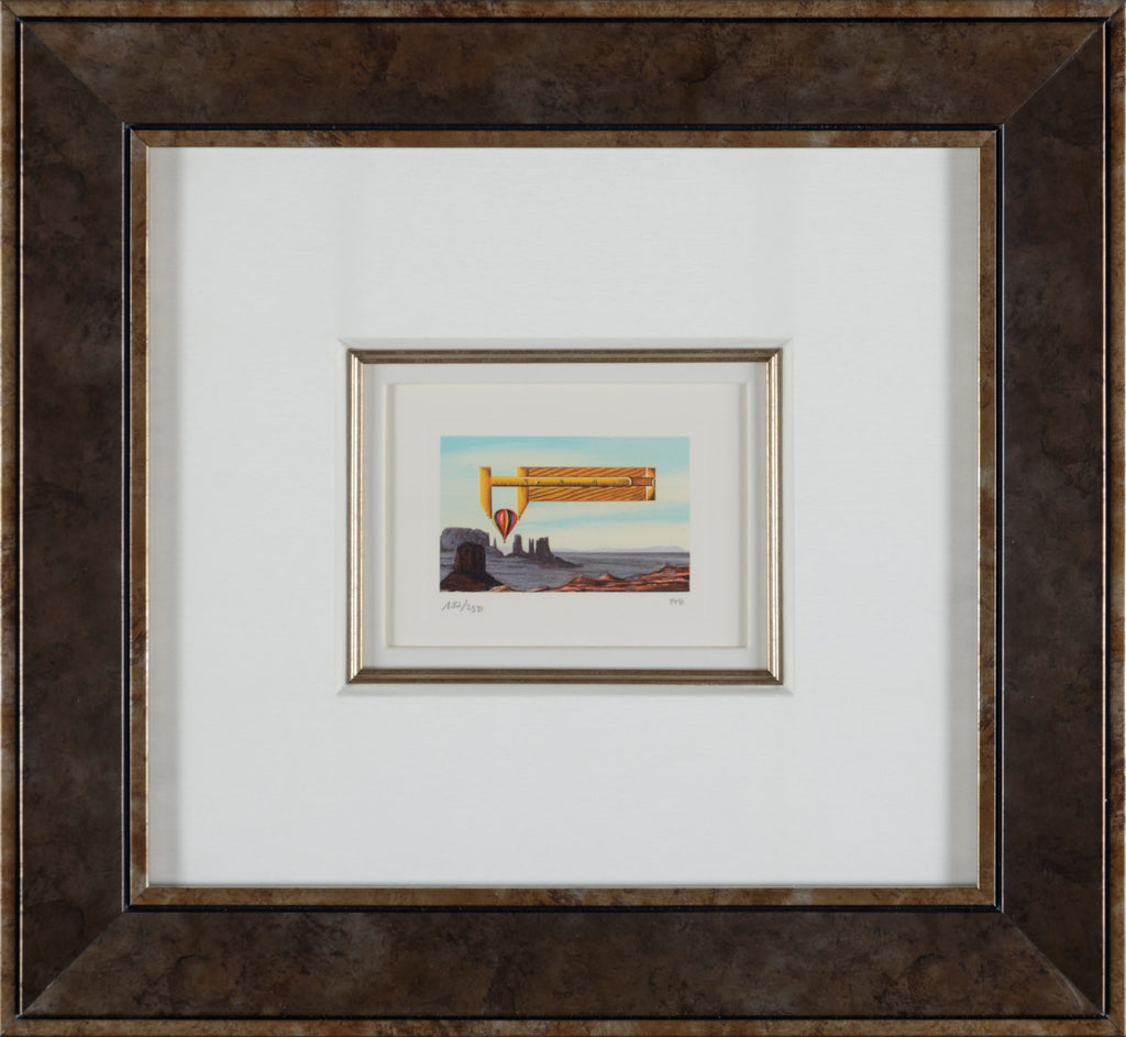 "Captive Balloon" is a lithograph created by Fanny Brennan in 1995. From the edition of 300, the artwork is initialed 'FMB' lower right and annotated lower left. The image size is 2.25 x 4" and the artwork is framed in a contemporary silver and dark gray frame. The artwork ships framed and accompanied by a certificate of authenticity.