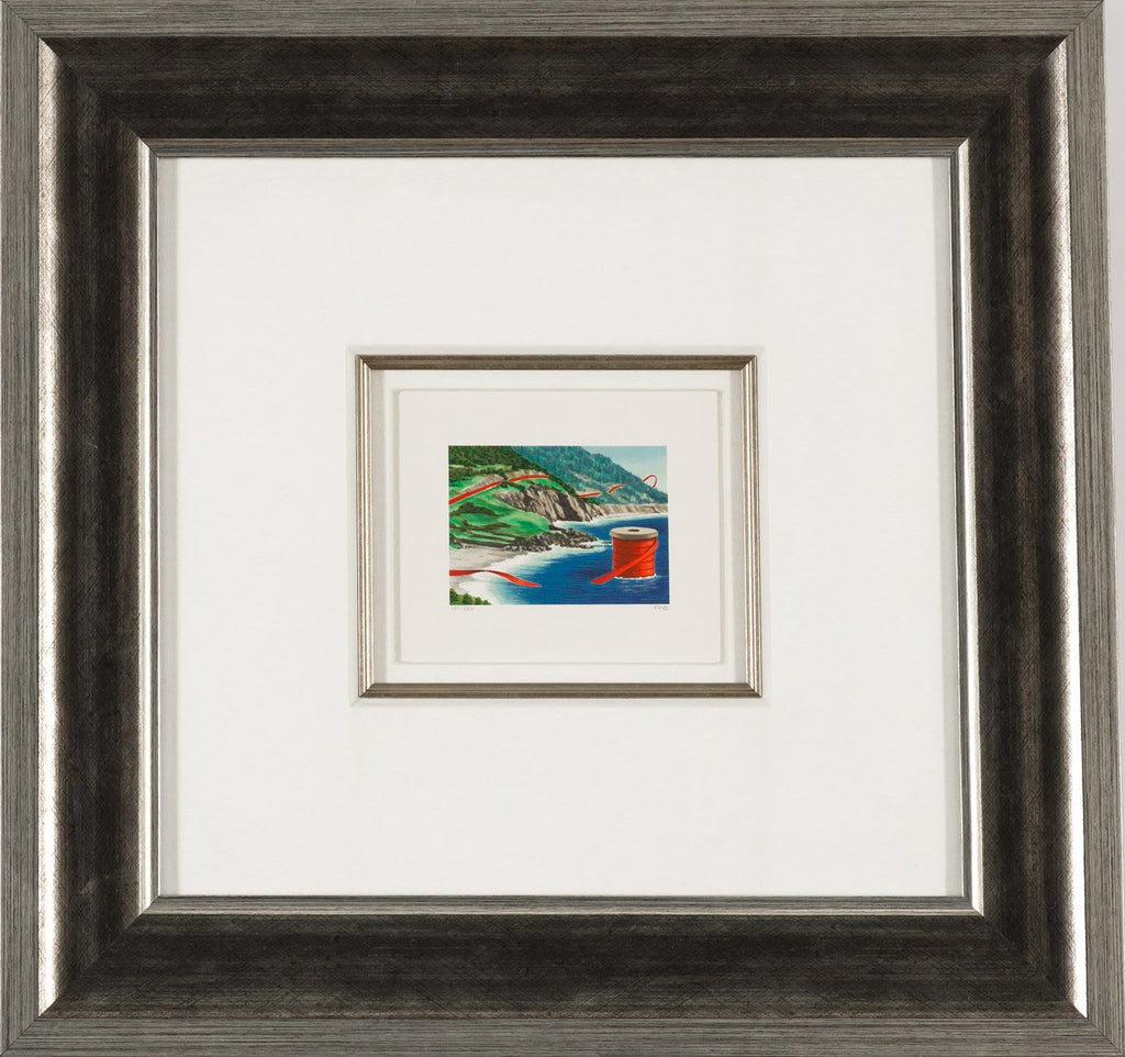 "Coastal Road" is a lithograph created by Fanny Brennan in 1993. From the edition of 300, the artwork is initialed 'FMB' lower right and annotated lower left. The image size is 2.25 x 3" and the artwork is framed in a contemporary silver and dark gray frame. The artwork ships framed and accompanied by a certificate of authenticity.