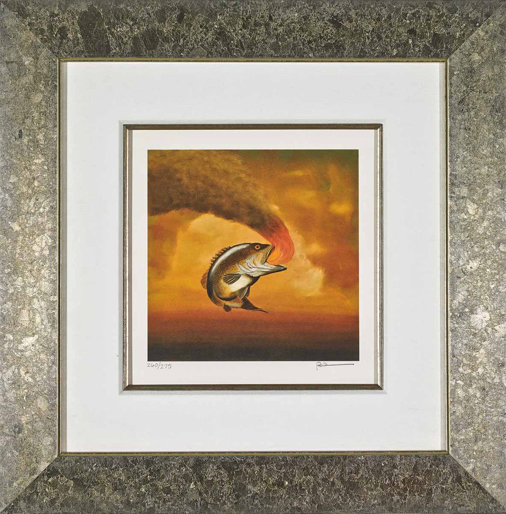 “Like a Fish Out of Water” is a classical Robert Deyber surrealistic artwork that depicts a fish out of water breathing what looks to be fire. “Chalk & Vermilion” and “Art Estampe” of Paris, came together and used a centuries-old traditional method of stone lithography to ensure that the “Like a Fish Out of Water” lithograph remains faithful to the artist’s vision. “Like a Fish Out of Water” is a 9.5 x 9 – inch hand-signed lithograph created in 2009. Each lithograph is hand-pulled in an edition of 395 and initialed by the artist.