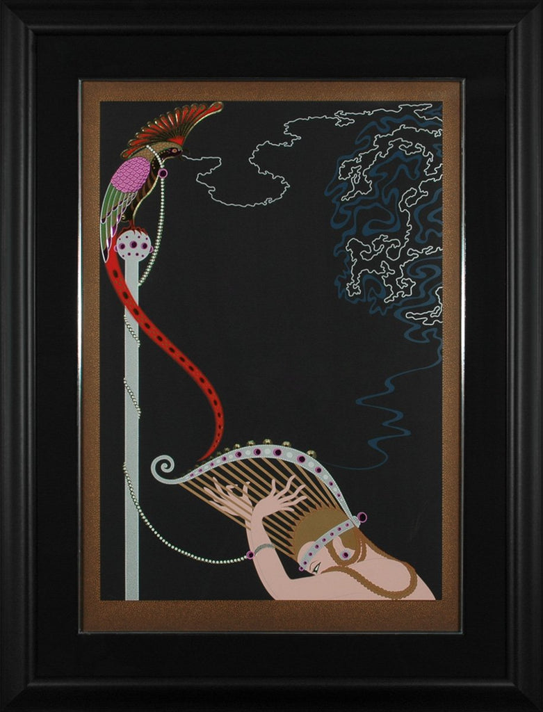 "Enchanted Melody" is an embossed serigraph with foil stamping created by Erté in 1985. From the edition of 405, the artwork is signed 'Erté' lower right. The image size is 42.5 x 29.75" and the artwork is framed in a contemporary black frame. The artwork ships framed and accompanied by a certificate of authenticity.