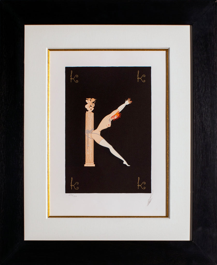 "Letter K" is a lithograph and serigraph created by Erté for his 1976 'Alphabet' suite. From the edition of 491, and the artwork is signed 'Erté' lower right. The image size 15.75 x 10.5" and the artwork is framed in a contemporary black frame. The artwork ships framed and accompanied by a certificate of authenticity.