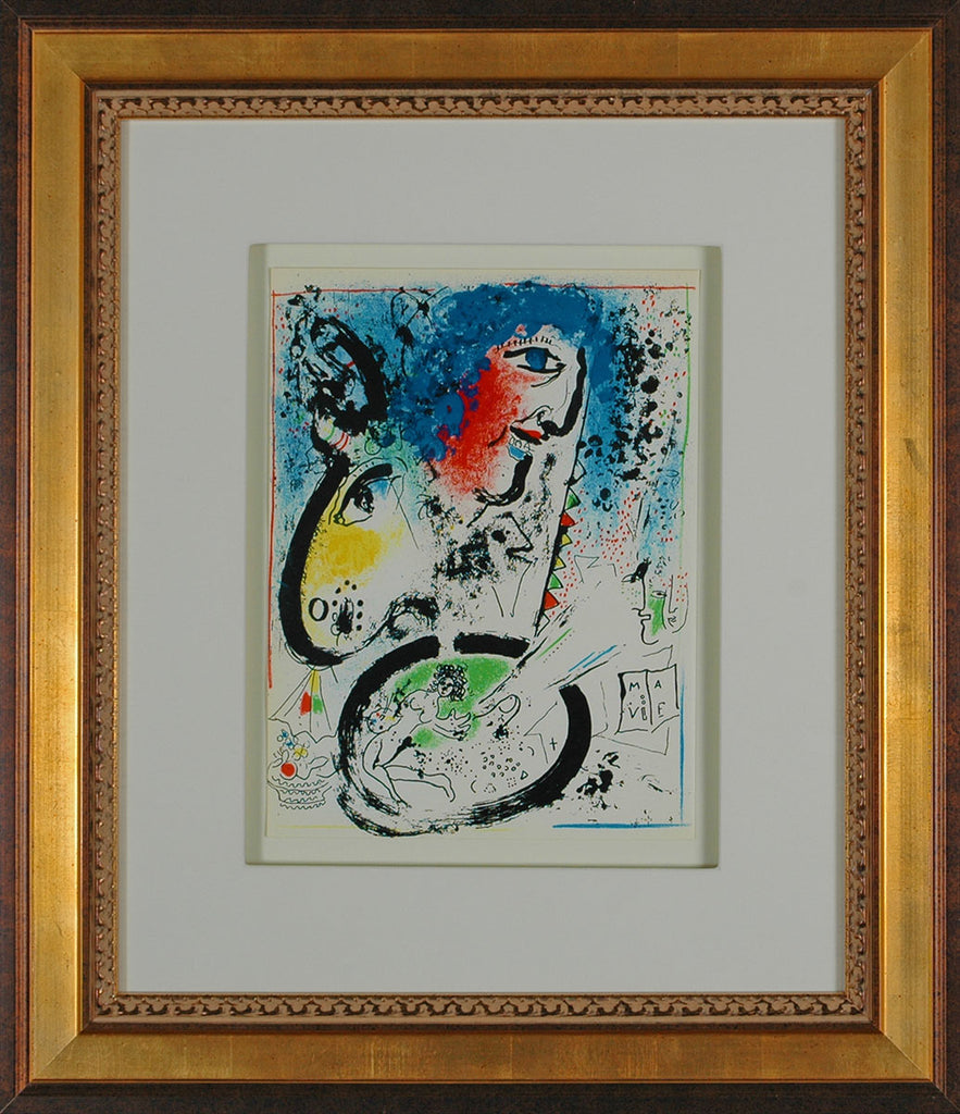 "Frontispiece, Self-Portrait (M.282)" is a lithograph created by Marc Chagall which was bound into Volume I of the Mourlot catalog raisonné of lithographs, printed in 1960. The total number of unsigned prints is unknown. The image size is 9.5 x 12.5" and the artwork ships framed and accompanied by a certificate of authenticity.