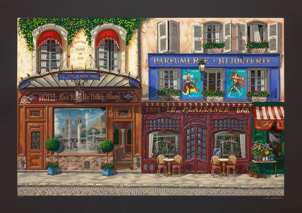 "Les Rives de Notre Dame" is a serigraph on black paper created by Liudmila Kondakova in 1997. From the edition of 100 on black paper, the edition also included 325 on white paper and 100 on canvas for a total edition size of 525. The artwork is signed 'Kondakova' lower right and annotated lower left. The image size is 24 x 36". The artwork ships framed and accompanied by a certificate of authenticity.