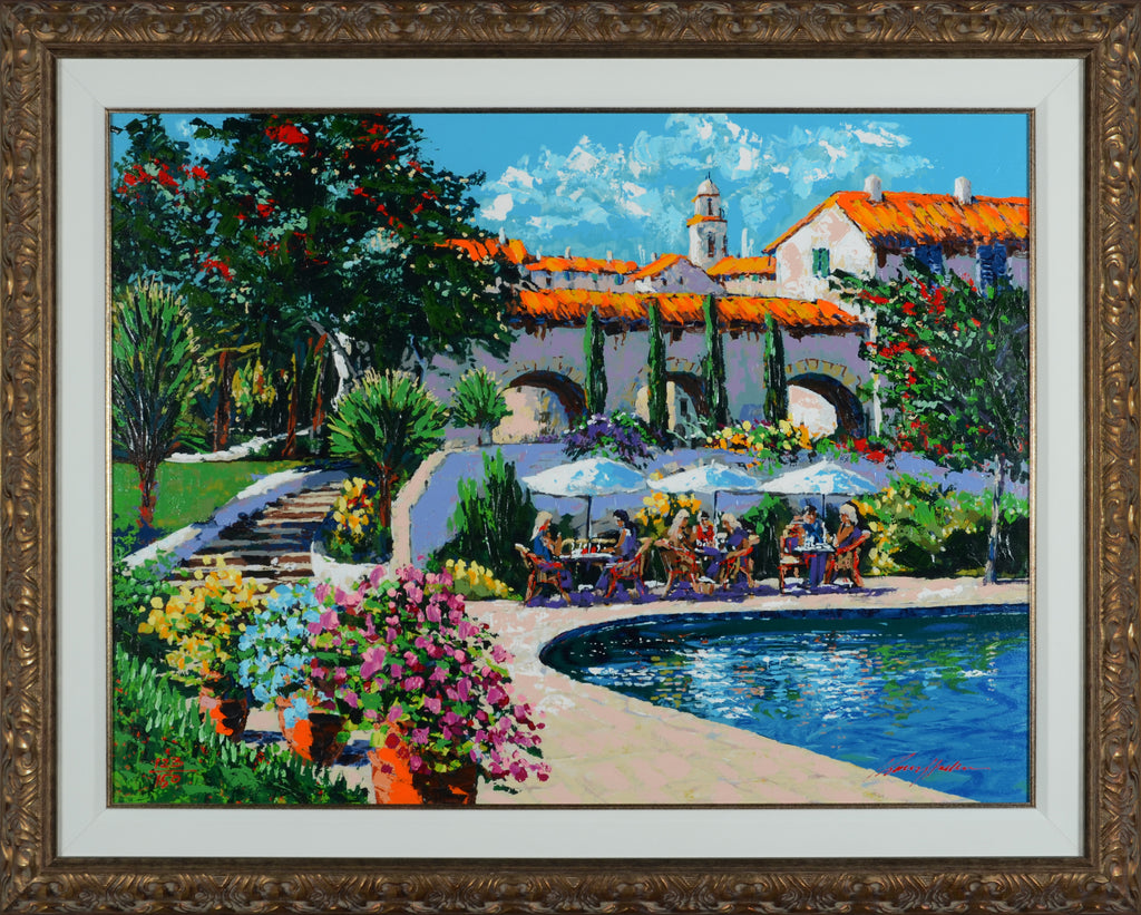 Originally from Northern England, Kerry Hallam has lived and worked in the United States since the late 70s. He received his formal art education at the London University School of Art. He exhibits bright light and vivid colors as an emotional force while depicting nautical and European-flavored experiences. Hallam paints in a true impressionistic style with clear Fauvist influence. His Mediterranean imagery is among his best-selling work, as well as some of his most passionate creations. His enthusiasm for the subject matter is strongly evident in all of his vivid seascapes and timeless, sun-drenched village scenes.In “Montecito” we see Kerry Hallam depicting a beautiful Santa Barbara scene. The artwork is an exuberant captivating view. A simple pool surrounded by flowers and astounding architecture is brought to life through Kerry Hallam’s expressionist brush.