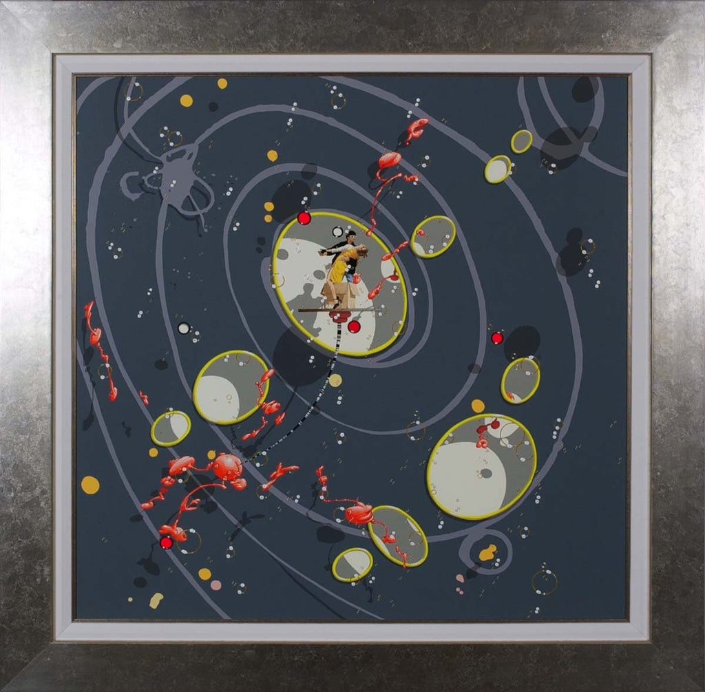 "Tango in a Box" is a serigraph on gesso board created by Philippe Bertho in 2006. From the edition of 237, the artwork is signed 'Bertho' lower right and annotated lower left. The image size is 34 x 34" and the artwork is framed in a contemporary silver-tone frame. The artwork ships framed and accompanied by a certificate of authenticity.