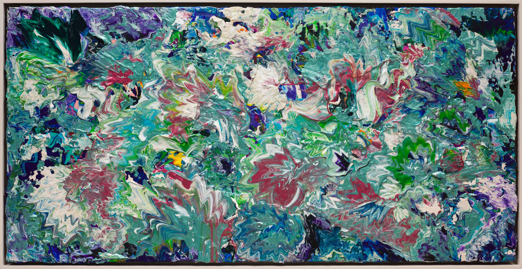 "The Gifts of Gardening" is an acrylic on canvas painting created by Robert Standish in 2024. The painting is signed, titled and dated on verso. The canvas size is 24 x 48" and the artwork is framed in a contemporary light wood frame. The artwork ships framed.