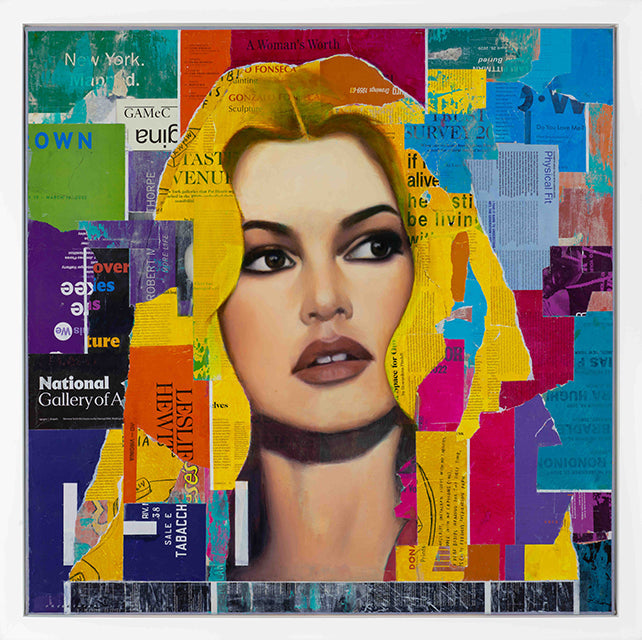 "The Initials BB" is an oil and mixed media on canvas painting created by François Fressinier in 2023. The artwork is signed 'FRESSINIER' lower left. The canvas size is 34.87 x 34.87" and the artwork ships framed in a contemporary white frame. The artwork ships framed.