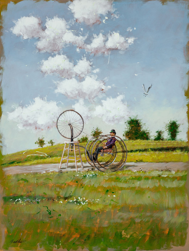 "The Perfect Bicycle" is an acrylic on canvas painting created by Philippe Bertho in 2025. The artwork is signed 'Bertho' lower left. The canvas size is 24 x 18" and the artwork ships framed in a custom contemporary white frame.