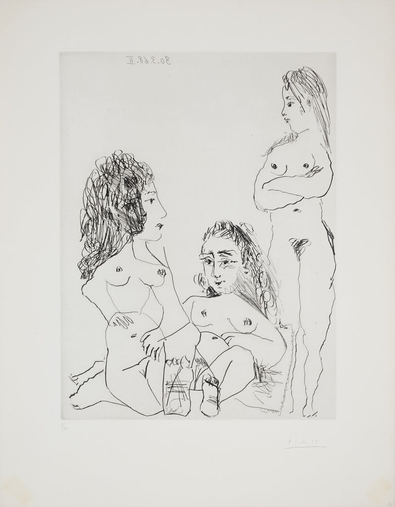 "Trois Femmes (B.1494)" is an etching created by Pablo Picasso for his '347 Suite' in 1968. From the edition of 68, the artwork is hand-signed 'Picasso' lower right and annotated lower left. The image size is 16.25 x 12.25" and the artwork is framed in a custom Spanish-style, closed-corner, black and gold frame. The artwork ships framed and is accompanied by a certificate of authenticity.